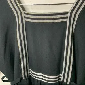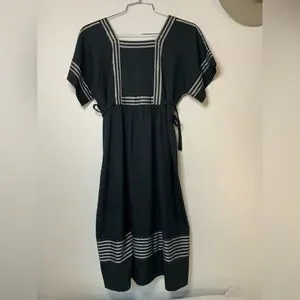 Vintage square neck tie side midi dress. Super flattering cut with great detail to trim and boho print on the bodice panel.