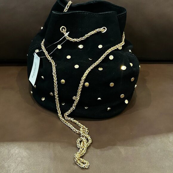 NWT Francesca's Cross Body Faux Suede Nailhead Bucket Satchel Bag Black Gold