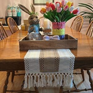 This bohemian table runner with tassels gives you a farmhouse stye vibes. Brand new without tag. It is 12x85 inches. No Trade please. Thank you for liking and sharing my listing 😍. I appreciate it 👍.