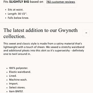 This sweet and classic style is made from a satiny material that's lightweight with a touch of sheen. We sewed a stretchy waistband and additional pleats into this skirt so it's superswishy - definitely one to twirl around in.