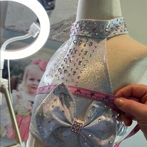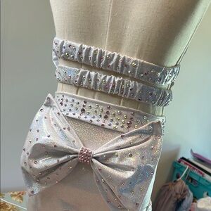 Shimmering silver halter top featuring sparkling rhinestones and a chic bow detail.