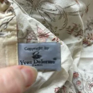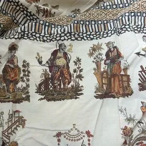 Unique fabric with vintage-style illustrations. Features intricate designs in cream, brown, and black., an imperfection in material as shown in last pic