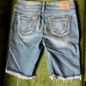 Stylish distressed denim shorts with frayed hems. Perfect for casual outings.