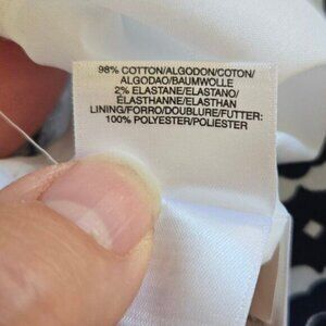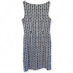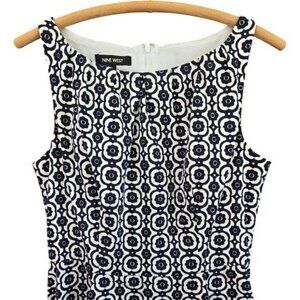 Nine West dress, floral print dress, size 10 dress, workwear dress, semi-formal dress, sheath silhouette, back zipper dress, cotton blend dress, tailored fit dress, classic design dress, sleeveless sheath dress, women's cocktail dress, blue and white dress, damask print dress
