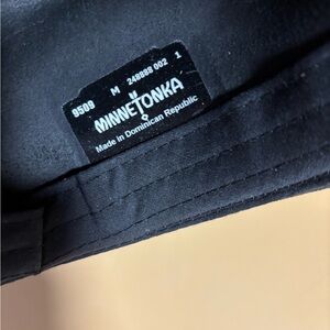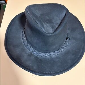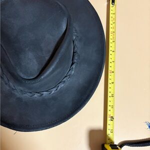 Stylish black leather cowboy hat with braided detail. Great for festivals and concerts. Very good gently worn condition from a smoke free and pet free home. Measurements in photos