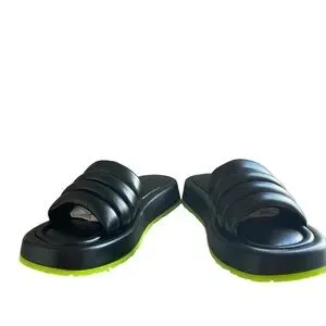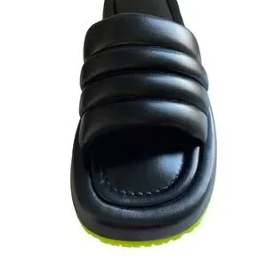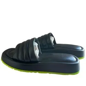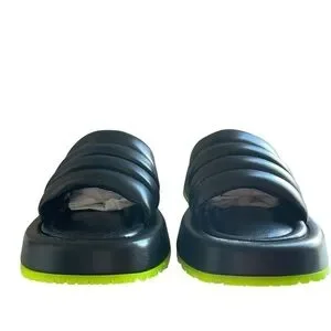 Horizontal quilting lends modern comfort to the wide vamp strap of a casual slide sandal set on a cushioned footbed and contrasting, logo-detailed sole.