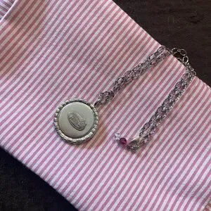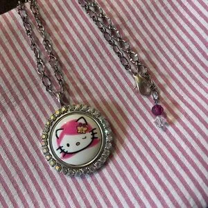 Adorable Tarina Tarantino Hello Kitty pendant necklace with silver chain, a pink and white design with Swarovski crystals.