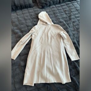 Stylish cream hooded coat with open front design. Features two front pockets.