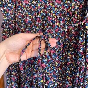 Charming floral dress with short sleeves. Features a colorful floral pattern.
