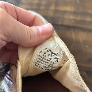 These Ed Hardy sneakers feature a captivating cream and red color scheme, highlighted by a unique floral pattern on the sides. Designed in a classic low-top style, they offer both comfort and a touch of artistic elegance. The white laces and soles add to their casual appeal, making them ideal for everyday wear.