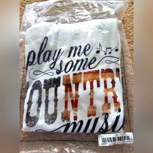 Short sleeve tee shirt with the graphics Play Me Some Country Music. 95% polyester makes this tee super soft and comfy. New in bag.