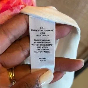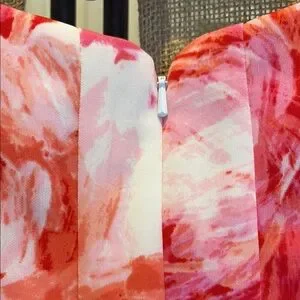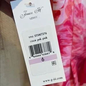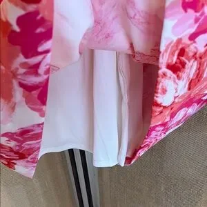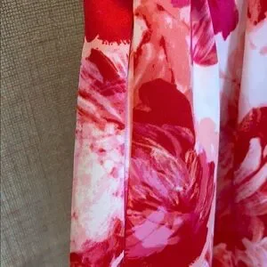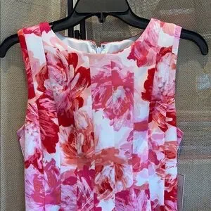 This elegant sleeveless dress features a vibrant floral pattern in shades of pink and hot pink. Perfect for any occasion, it offers a stylish and comfortable fit. Hidden back zipper and hook and eye closure. Pleated. Line//Integrated slip. Soft cool fabric. New.