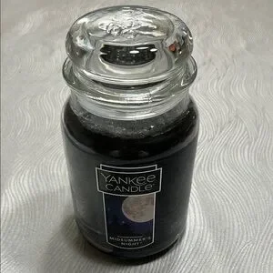 Classic Yankee Candle in Midsummer's Night scent. Elegant black wax. Iconic glass jar with lid.