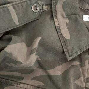 Good American military jacket camo camouflage jean stretch denim 98% cotton 2% elastane soft stretch fabric, not too heavy, very comfortable material, zip front, snap chest pockets, side slit pockets, snap close cuffs, women’s plus size 2/3 is equivalent to a size extra large XL 14 16 new with tags NWT