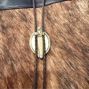 Stylish bolo tie featuring a tiger’s eye stone and gold tone trim. Brown braided leather adds elegance. Wear boho style with a t-shirt and jeans to a country festival. Cord is 34” long so it hangs at 17”.
