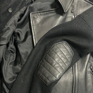 Elevate your style with the Vince Women's Black Leather and Wool Jacket. This sleek and sophisticated piece features a classic design perfect for any occasion. Crafted with high-quality materials, it offers both comfort and durability. The black leather adds the edge and timeless touch to your wardrobe, the wool is sophisticated and comfy. Perfect for spring.