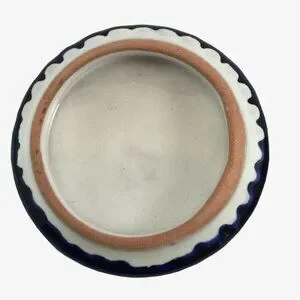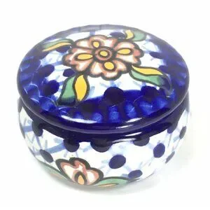 This is a wonderful multi-colored pottery trinket box or dresser box in the traditional Mexican design.