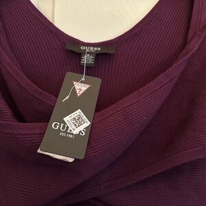 Elevate your style with this elegant plum purple dress from Guess. Size medium. NWT. Featuring a chic design and long sleeves, it's perfect for any occasion. Open cut at the waist to make this dress cute, warm, comfortable, and striking!