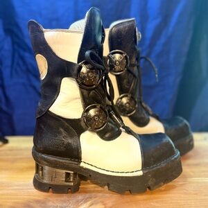 These black and white high-top boots are crafted for both style and functionality, featuring a robust lace-up system with metal eyelets. The combination of leather-like and rugged materials ensures durability, while the thick sole provides excellent traction for various terrains.