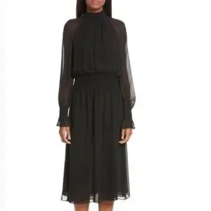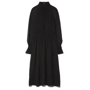 Our Colette Dress is a demure choice for day and evening events. It sculpts a flattering hourglass silhouette in silk georgette with smocking at the waist and flared cuffs, sheer billowy sleeves and a full skirt that falls past the knee. A high neck further plays up its ladylike feel.