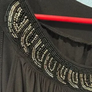 Elegant black sleeveless dress with intricate beaded neckline. Perfect for a night out. Not missing any beads! Beautiful dress!