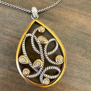 Its teardrop pendant houses an intricate and fluid design. - Closure: Lobster Claw - Length: 18" - 38" Adjustable - Features: Convertible - Pendant Drop: 2 1/2"