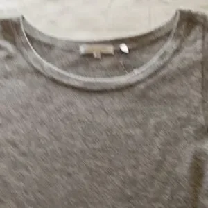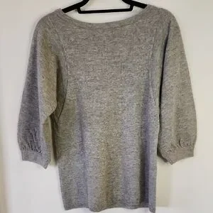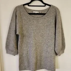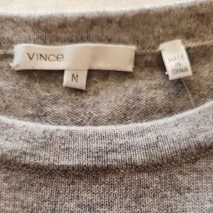 This NWT Vince sweater in a soft gray hue features a classic crew neck and three-quarter length sleeves, offering a relaxed and comfortable fit. The cashmere fabric provides a cozy texture, making it a versatile addition to any wardrobe. Size M.