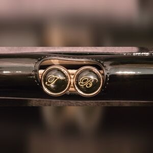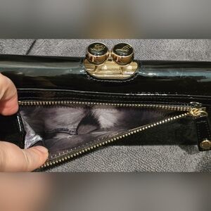 Women's, black, patent leather, clutch wallet. Bobble matinee wallet. Snap closure in front. Exterior zipper pocket. 4 card slots in front, bobbles open up to reveal a divided pocket. Metal at base of bobbles is still covered in protective clear plastic. Open divided pocket. Open pocket on top with 1 window slot for ID & 7 card slots. Exterior is 100% leather (patent), interior is non-patent leather with 100% polyester lining. A very small ink stain and some minor discoloration as shown in photos on inside of wallet.