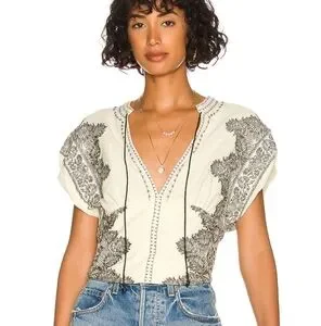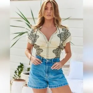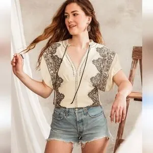 NWT Gimmicks Buckle Embroidered Boho Blouse Smocked Back