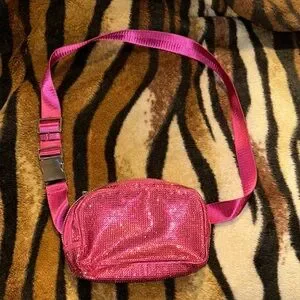 Shimmering pink belt bag with adjustable strap. Perfect for adding a pop of color.