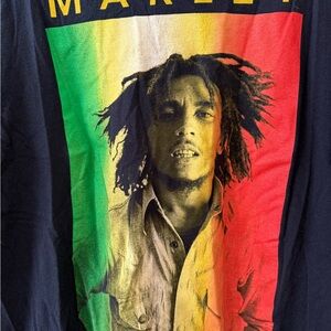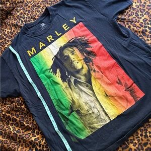Black t-shirt featuring a vibrant Bob Marley graphic! This would make a great over-sized band tee! Also it’s in great condition!