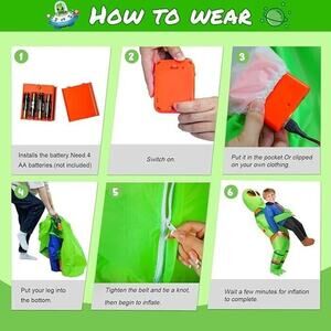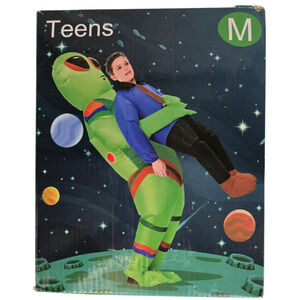 Teens Size Medium Fits 4.6' - 5.3' Tall【Sturdy and Durable】This kids Alien Warriors inflatable costume is made of 100% polyester fiber, designed by our professional designers, exquisite craftsmanship to improve the durability of the inflatable costume, tear-proof【Product Size】Alien Abduction inflatable costume fits most kids between 4.6 and 5.3 Feet, you can refer to the size chart in the picture for more size details to choose the right Halloween costume and become a striking alien playing a role in the party【Usage】The Halloween inflatable costume has a quality battery-powered fan that inflates quickly. Requires 4 AA batteries (batteries not included), before putting on the costume, please tighten the outer ring to secure the fan, otherwise, the loose outer ring will cause the fan to fall off during movement, there are elastic bands on the neck, ankles and wrists to keep the costume inflated for a long time【Multi-scenario Use】Funny Alien Abduction Inflatable Costume is perfect for outdoor, Halloween costume party, Halloween night events, Christmas, birthday parties and carnivals. Easy to walk, jump, sit, run and dance, you will be the winner of every costume contest and add a lot of fun to your event