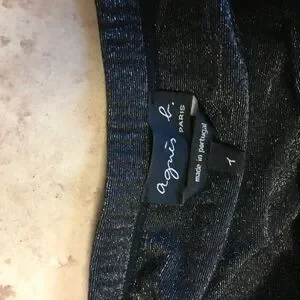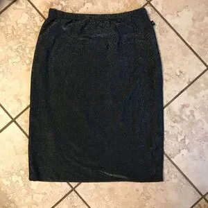 black and silver stretchy body con pencil skirt above knee length by Agnes b measures like a size small 12.5 inches across waist and 21 inches in length
