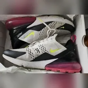 Nike Air Max 270 sneakers featuring a white and black design with pink and neon green accents.