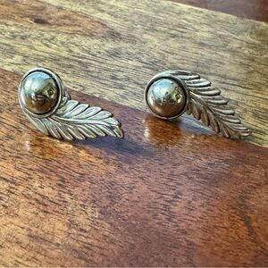 Beautifully detailed vintage sterling silver earrings featuring a high-polish orb paired with a stylized feather or leaf design. These screw-back earrings are marked “Sterling” on the underside of the closures and appear to date from the 1940s to early 1950s, based on the construction and closure style. Timeless mid-century elegance with a sculptural edge. Unmarked maker. Moderate patina consistent with age.