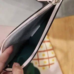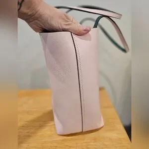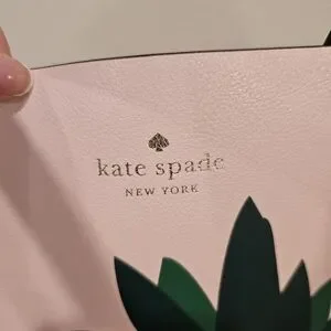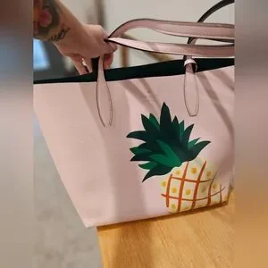 This stylish Kate Spade tote bag combines a soft pastel pink with vibrant green accents, with Pineapple design. Leather tote it offers a spacious interior and a flat bottom for easy carrying. The bag's playful polka dot pattern and tropical motif make it a standout accessory for any occasion. Excellent pre-owned condition. one small ink mark on back see all photos. Measurements: 12.5 h x 14 w x 6.25 d