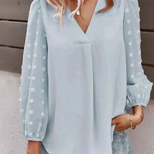 Sweet Polka Dot Long Sleeve V-Neck Top. Lightweight woven fabric as it shapes a V-neckline and long sleeves with polka dot and elastic cuffs. Breezy, wide-cut bodice falls to a rounded, slightly cropped hem.