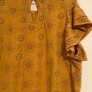 ANTHROPOLOGY MUSTARD YELLOW FLATTER SLEEVE EYELET EMBROIDERED COTTON TOP SIZE L