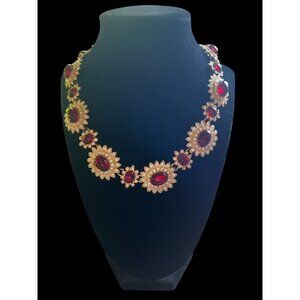 Vintage Gold Tone Red Rhinestone Floral Necklace. Arnold Scaasi Ruby Red Glass &