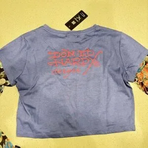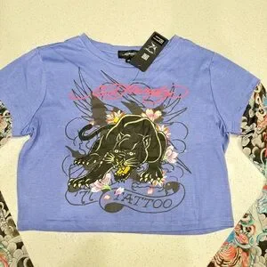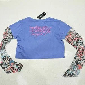 Ed Hardy blue long sleeve top with tattoo graphic. Features colorful design on sleeves. Beautiful bright colors. Pink blue, purple, black and grey tattoo sleeve long sleeve t shirt crop top.