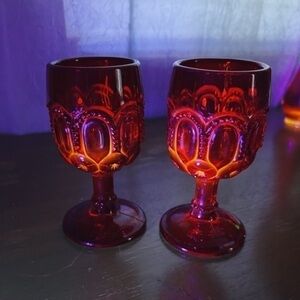 This is a set of two Moon and Star Ruby cordials made by L.G. Wright Glass in the 1970s-80s. The deep ruby red color and classic Moon and Star pattern make them a beautiful addition to any collection or barware set.