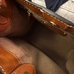 Description : Carriage printed handbag. Printed coated canvas and polished pebble leather, inside zipper pockets, snap open and closed, fabric lining, removable shoulder straps for crossbody or shoulder wear
