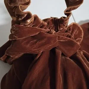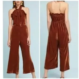 New With Tags, with a hole on the side leg can be sewn shown in pictures, Also size Large more like a Small, please see measurement, Still adorable, Halter ruffle, Button closure, Hidden side zip, Ribbon Coquette bow at front front, Wide Crop legs, No stretch, Light enough for Spring wear, Anthropologie Kristinit Gold Velvet Wide Leg Jumpsuit, Size says Large more like a Small.