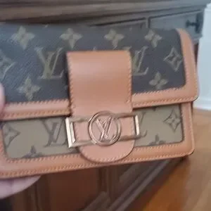 not authentic Elegant Louis Vuitton women's bag in a stylish brown and tan design. Perfect for adding a touch of luxury to any outfit.not authentic at metal logo has some wearused like wallet &shoulder bag. not authentic great condition