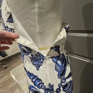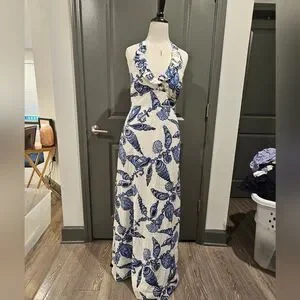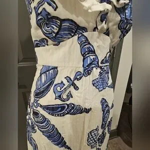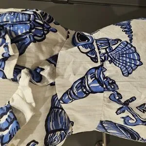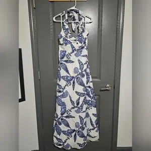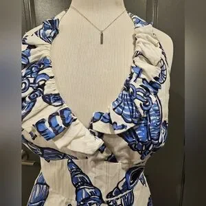 This stunning sundress by Lilly Pulitzer features a vibrant blue and white pattern, perfect for resort wear. The dress boasts a stylish tie front and a halter neckline, offering a chic and breezy look. Its backless design adds a touch of elegance, making it ideal for sun-soaked getaways. Fully lined, pit to pit 17. Excellent pre-owned condition!