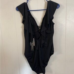 Equally parts sexy and sweet, this one-piece swimsuit features a plunging neck and back trimmed with romantic ruffles. Built-in tummy control and moderate coverage in the rear provides a confident fit. Detail we love: crisscrossing straps at the center that keep the suit from revealing more than you want. NWT size 10.