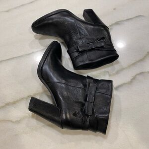 Kate Spade Boots in size 9M. Black leather with Bow on sides. Approx 4 inch heel. Only flaw is some knicks on back of left heel shown. Has some minor creasing on leather from wear and minor wear on heels. Otherwise great preowned condition.