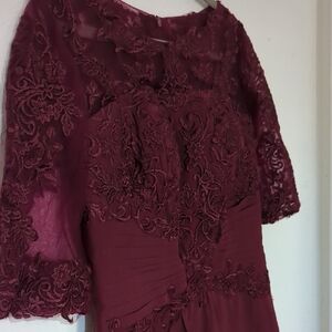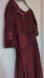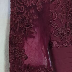 This stunning burgundy evening gown features intricate lace detailing and a flowing silhouette. Perfect for special occasions, this dress combines elegance and style.