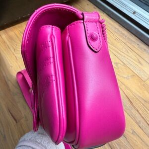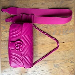Elevate your style with this chic Gucci pink leather bag. Perfect for any occasion, this bag combines luxury and functionality. Marmont pink. Like new was worn couple of times- has no scratches no stains no scratches on enamel hardware. Dimensions: 10.5x6x2.5 has metal enamel short strap 24in and an adjustable textile strap 37in long. Comes with box and a dust bag.