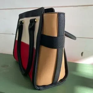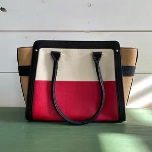 This stylish tote bag features a striking combination of red, cream, and tan colors, perfect for any occasion. Its elegant design and spacious interior make it a must-have accessory. In excellent condition.